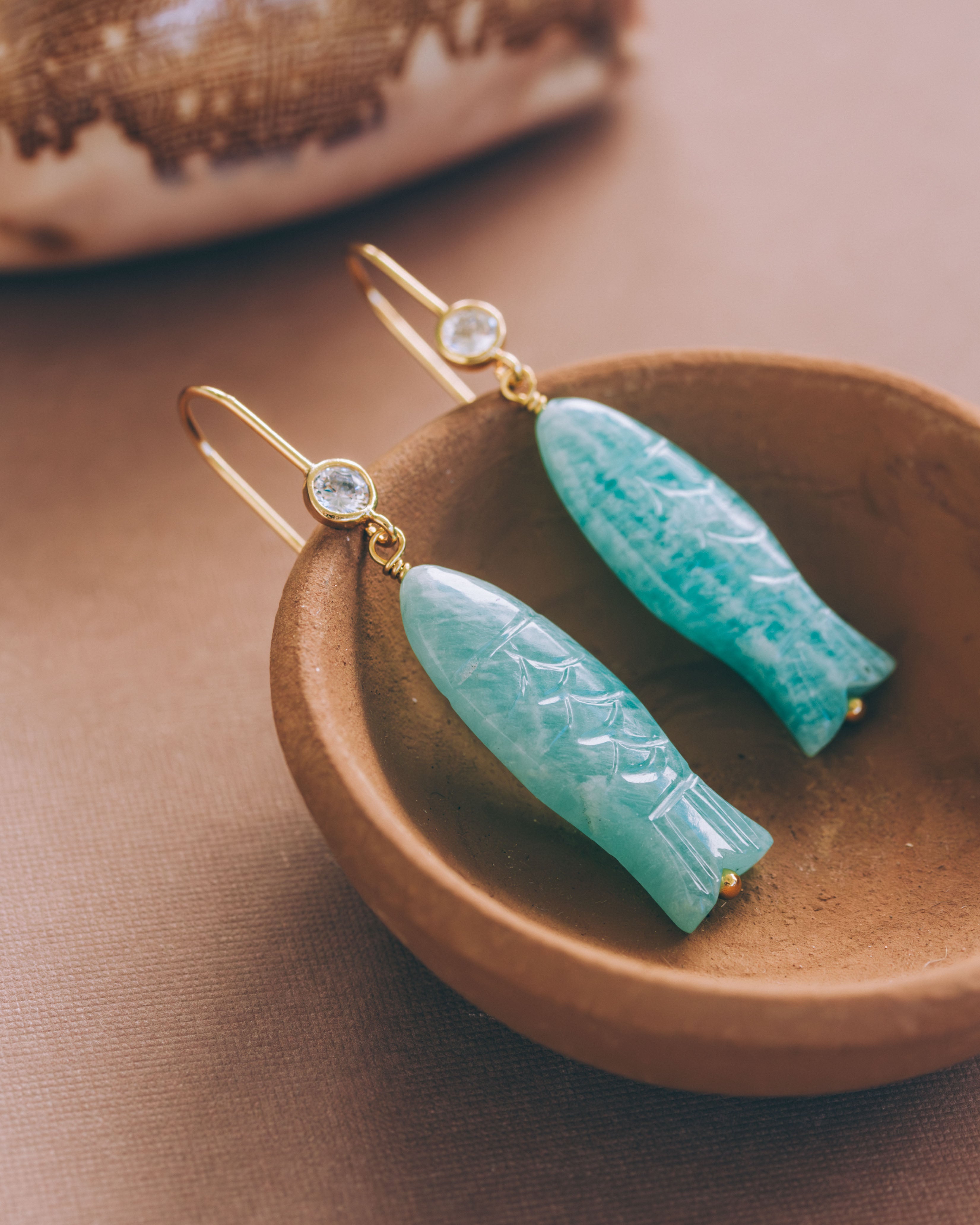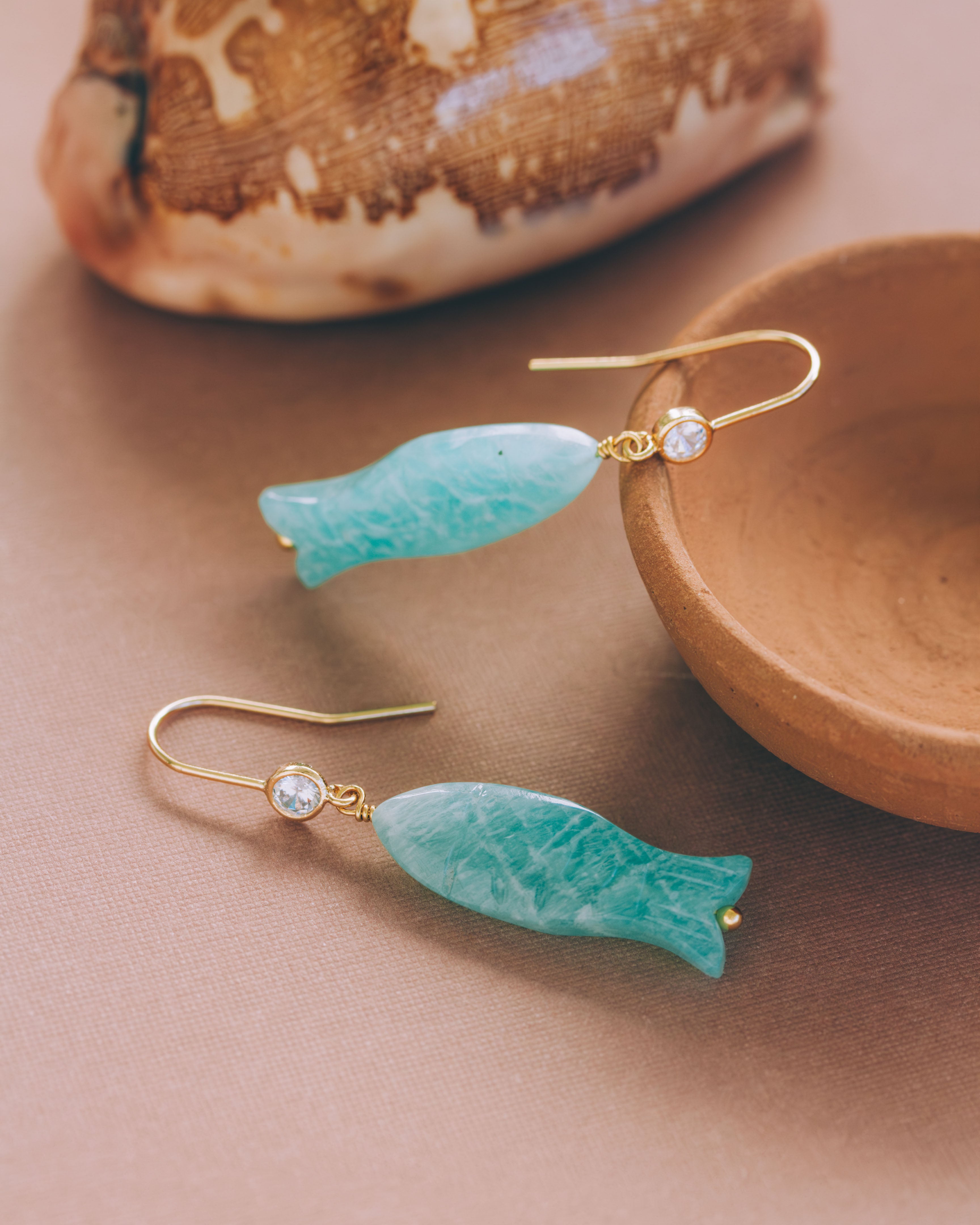 Like the turquoise waters of the Ibiza coast, these vibrant, breezy earrings offer just the right amount of whimsical style. Each fish is carved from genuine stone and hangs from gold-plated fish hook–style ear wires, topped with a CZ for a subtle sparkle.