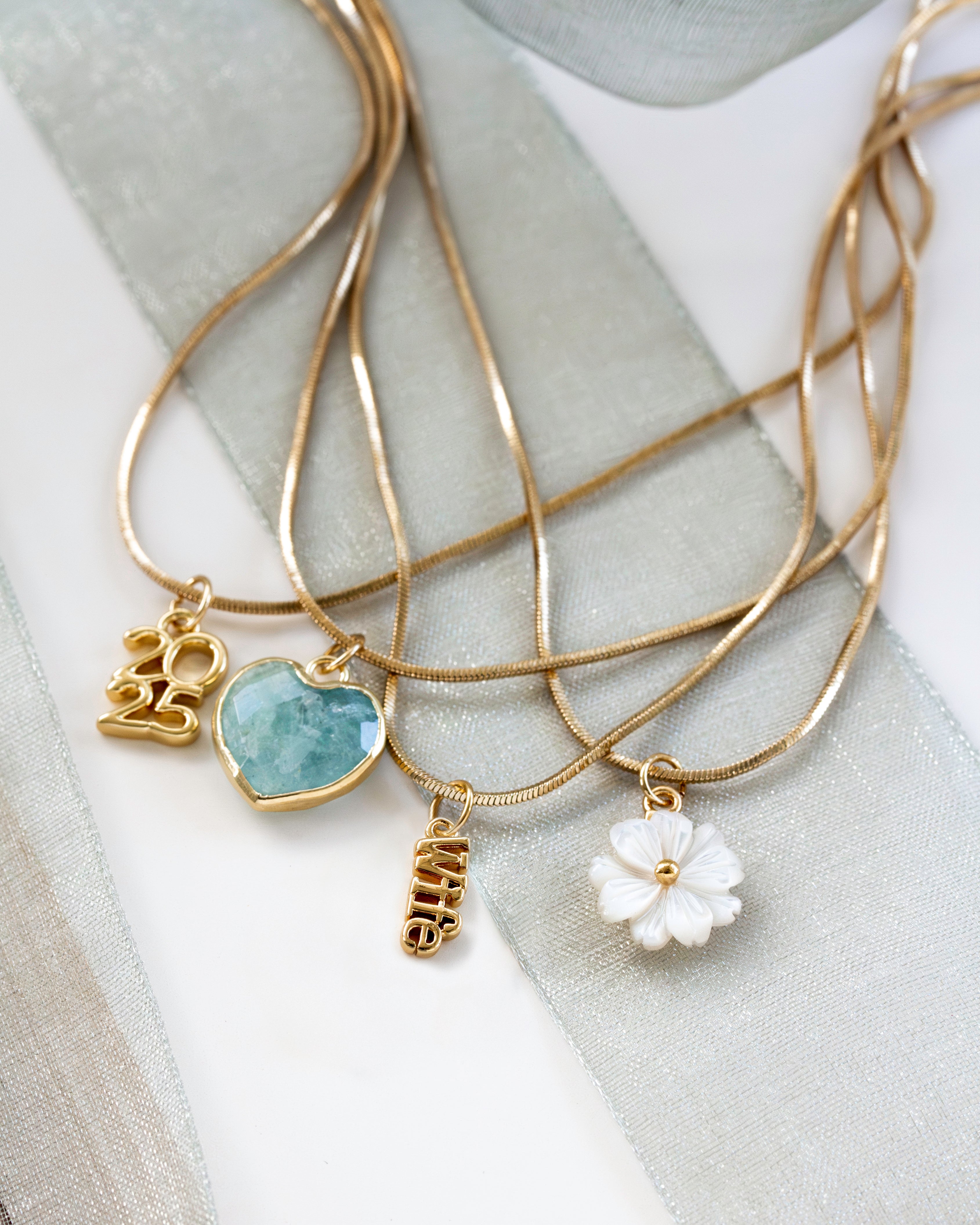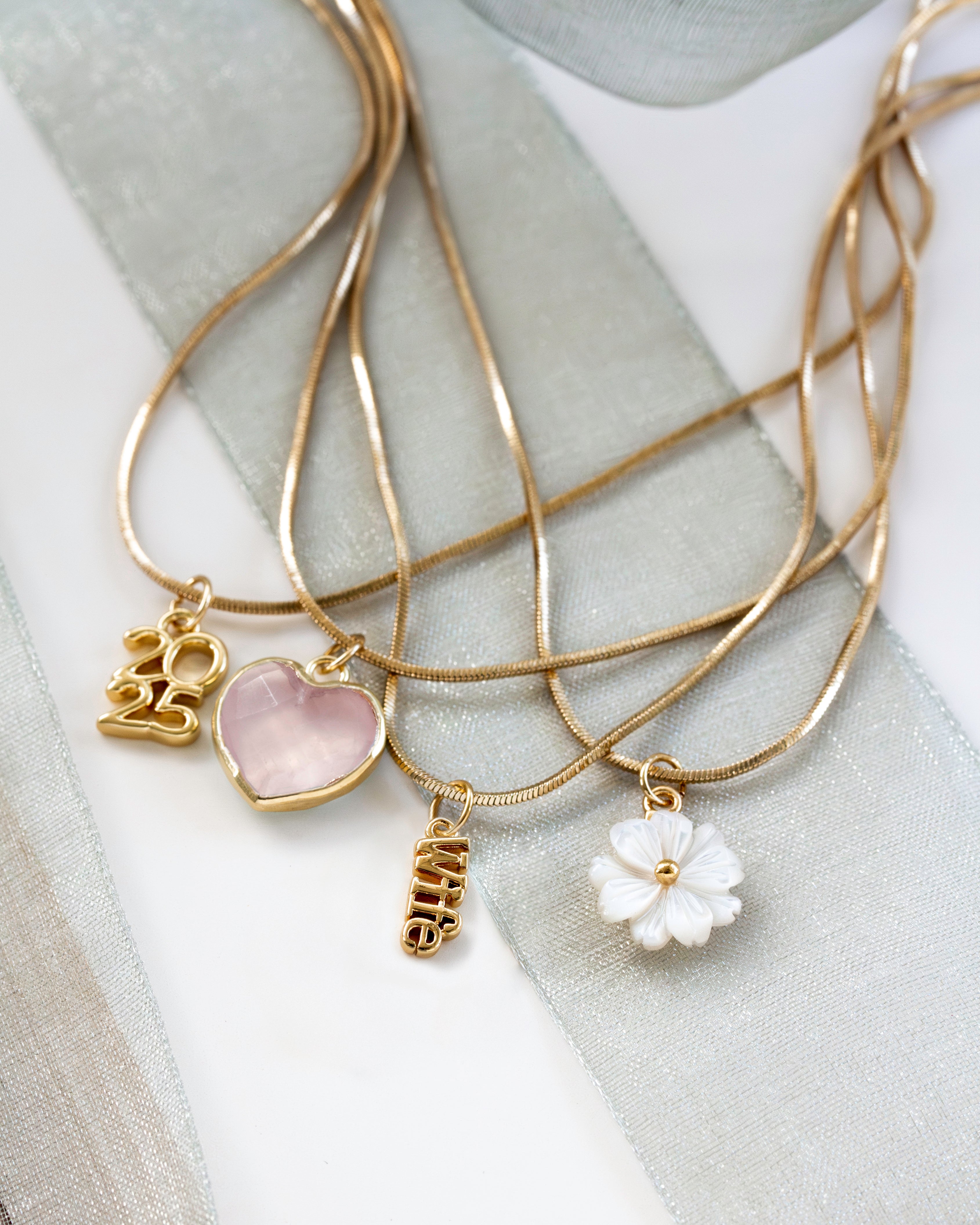Each charm tells part of your story: a number charm to mark your wedding year, a carved flower as a sweet nod to your bouquet, a heart for the love that started it all, and a “wife” charm to celebrate your brand-new title (and the fabulous role you were born to play).