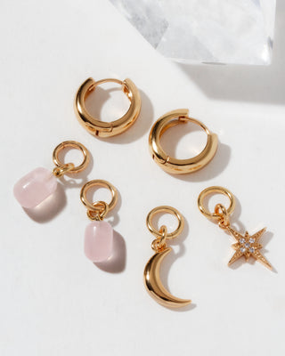 Introducing our Interchangeable Hoop Earring Charms, designed for endless mix-and-match possibilities. Effortlessly sliding onto our Huggie Hoop or Elevated Huggie Hoop, these versatile charms let you reinvent your hoops and style to suit your mood. Swap out charms for a fresh look every day!