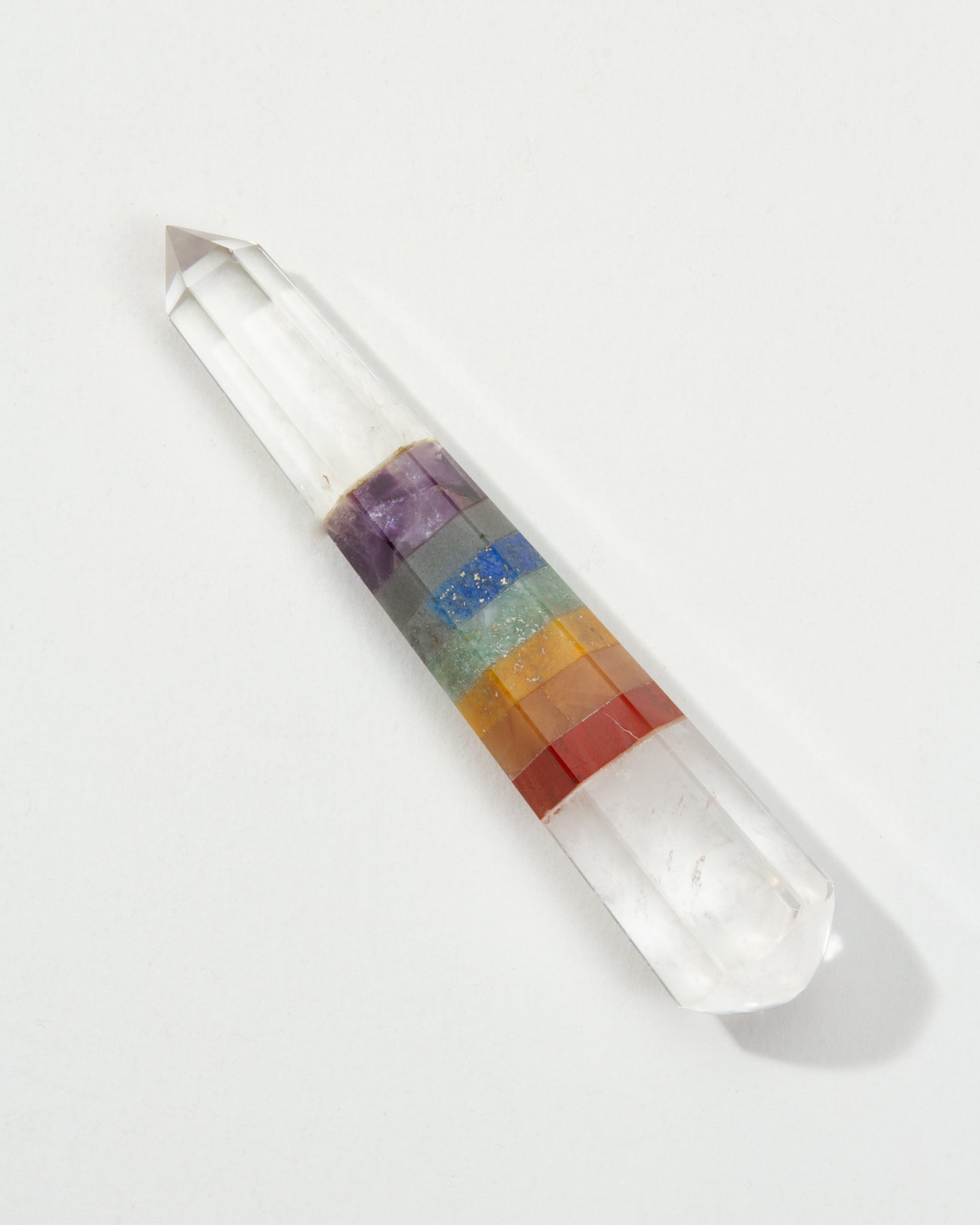 A powerful, all-in-one piece designed to bring intention, balance, and beauty together. Crafted from fused genuine gemstones, this large, high-quality wand features clear quartz at both the top and base, anchoring a vibrant center of carefully selected stones.
