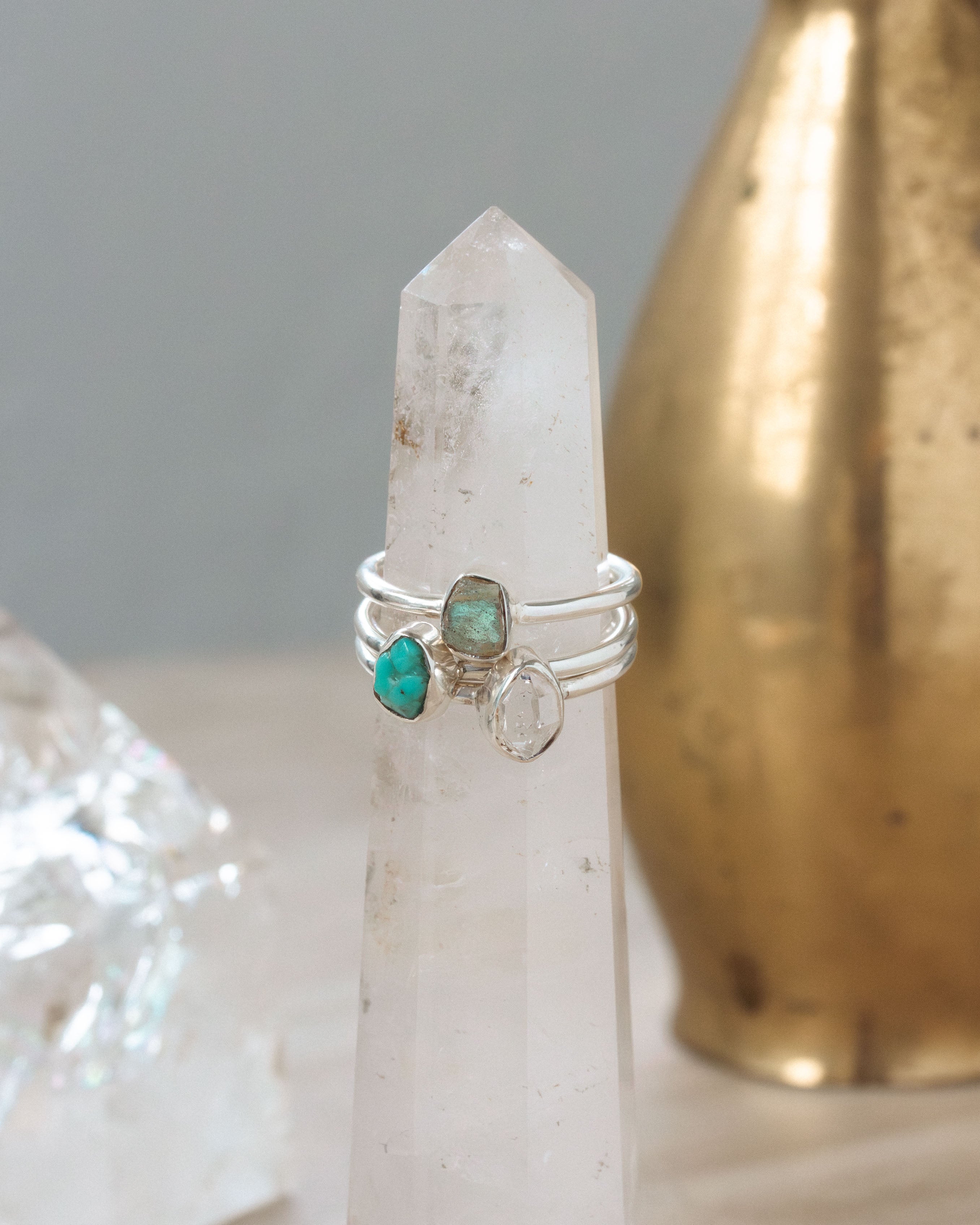 A Herkimer Quartz ring brings clarity and light, amplifying positive energy and intention. The Turquoise ring embodies truth and protection, carrying calming blue tones reminiscent of open skies and desert horizons. Finally, the Labradorite ring reflects transformation and inner strength, flashing with hues of blue, green, and gold that shift with every movement.