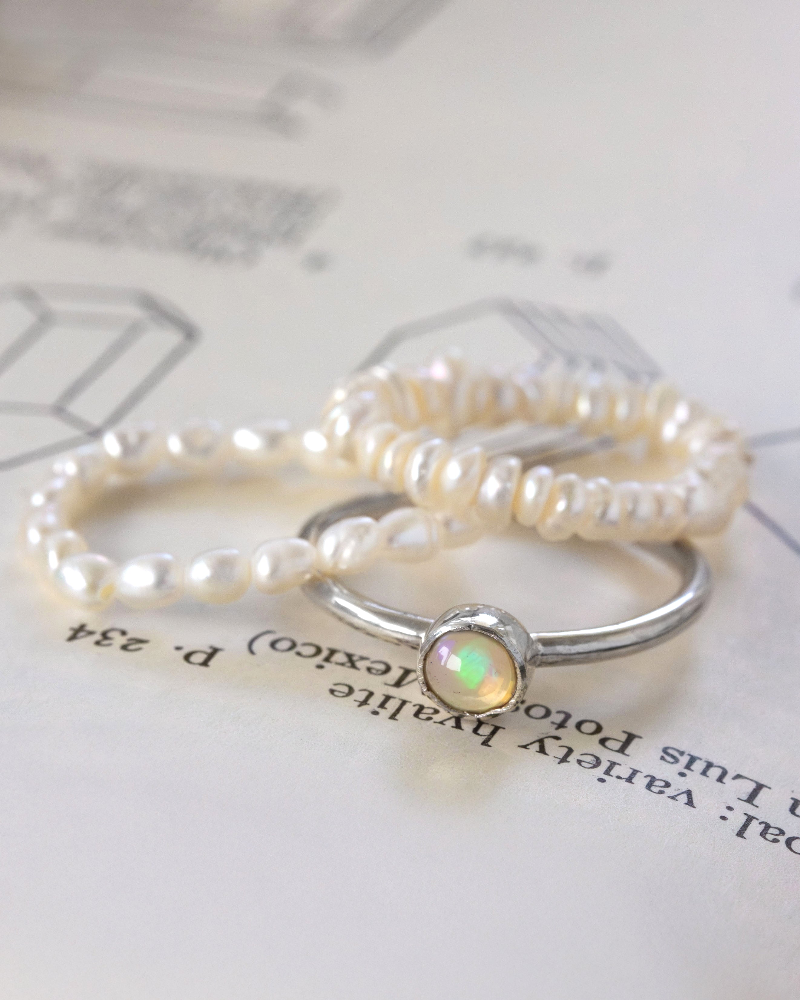A genuine opal ring reflects the shifting colors of sea and sky—symbolizing creativity, intuition, and transformation. A sterling silver pearl ring adds soft, ocean-born radiance, while a cultured freshwater pearl stretch ring stacks comfortably alongside, creating a textural mix that’s as unique as it is versatile.