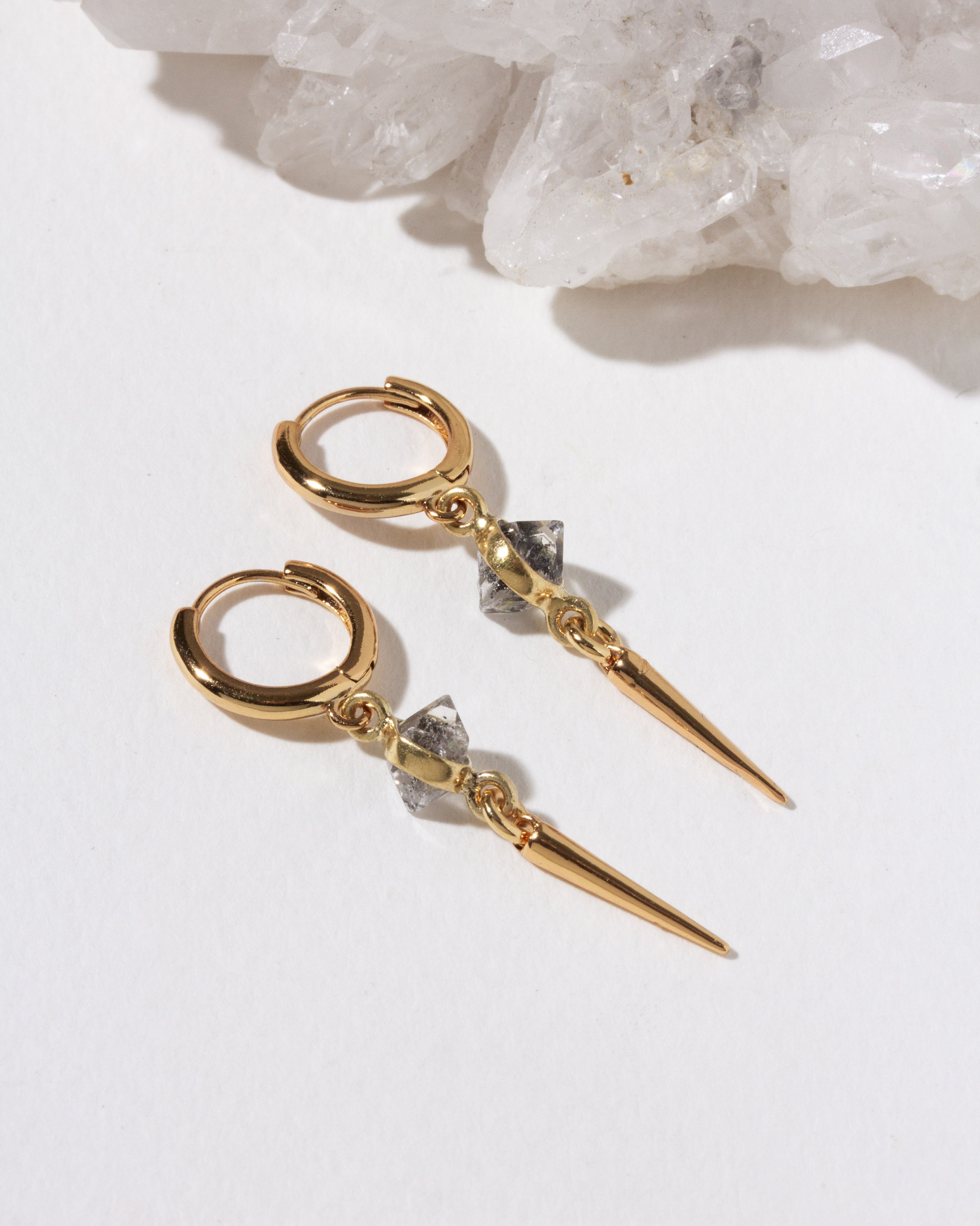 A little power, a little sparkle — all attitude. These hoops feature raw Herkimer quartz points, known for amplifying clarity and energy, paired with sleek golden spikes for that perfect edge. Whether worn solo or stacked, they strike the balance between bold and bright — a reminder that true power shines from within.