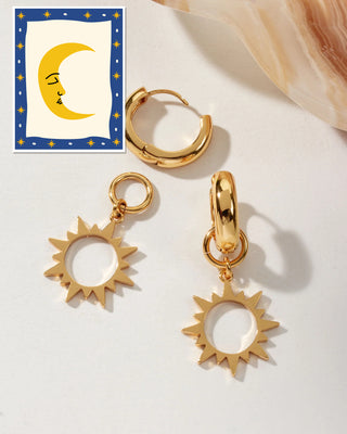 The Adorned Sky Gazer Set shows a gold bracelet with moon charm and gold hoop earrings with moon and star charms.