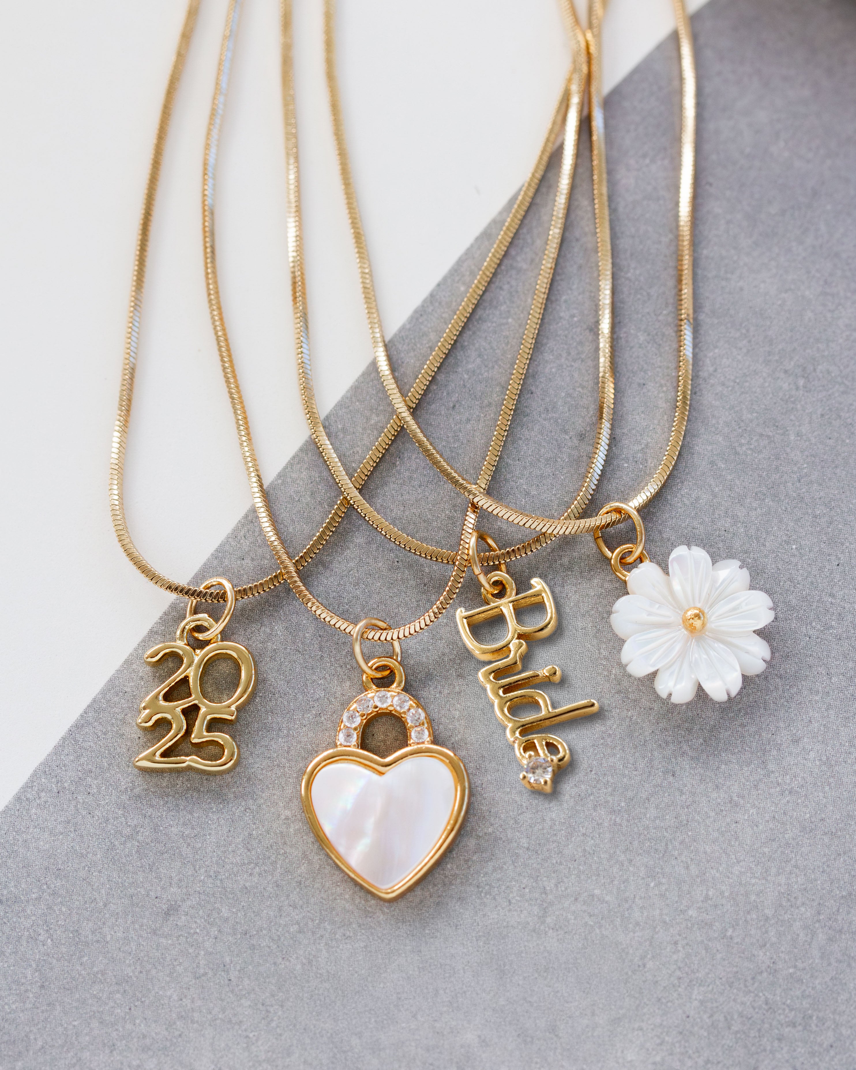 Crafted from sleek, gold-polished snake chain, this necklace features four individual strands fused, creating a unified, layered style. A mix of meaningful charms adds to its sentimental feel—from the carved flower (a sweet nod to your bouquet) to the locket heart, symbolizing lasting love.