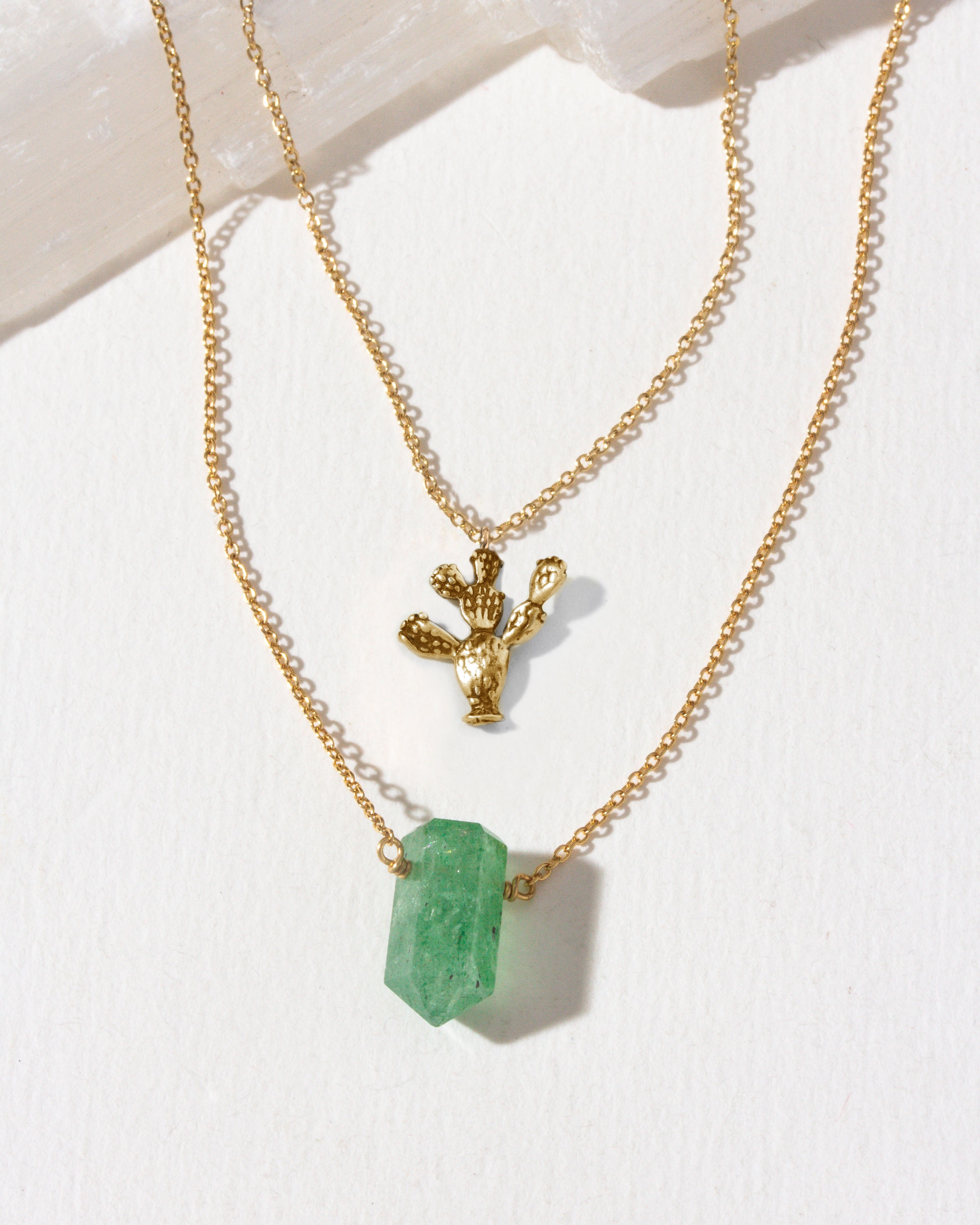 Just like the cactus thrives where few others can, aventurine is known as a stone of growth and good fortune—together, they’re a symbol of strength and prosperity.