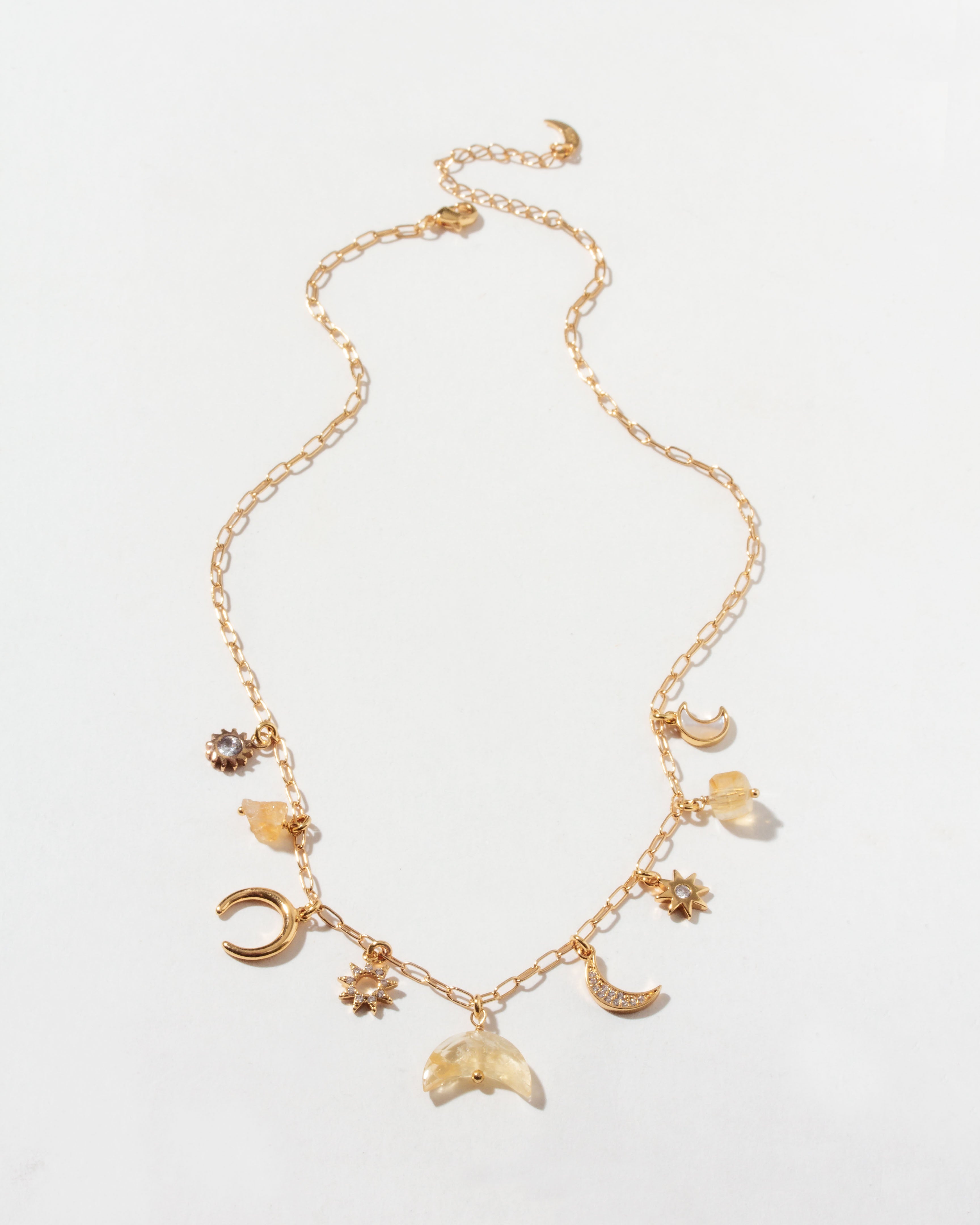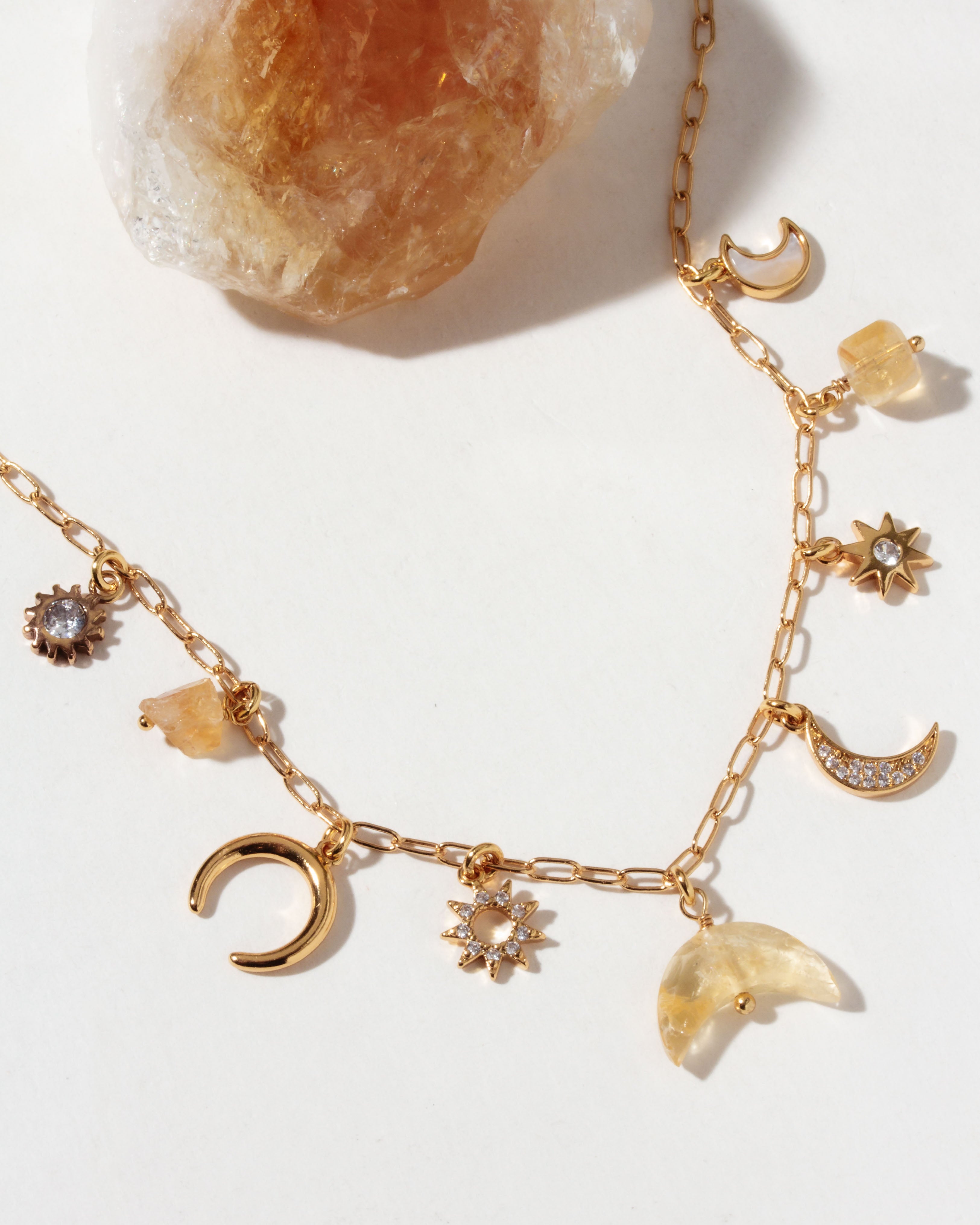 Bright, warm, and full of optimism—citrine is November’s birthstone and a gem for anyone who loves a pop of golden light. Our buttery yellow charm necklace captures the glow of the season, accented with faceted citrine beads and celestial moon-and-star details.