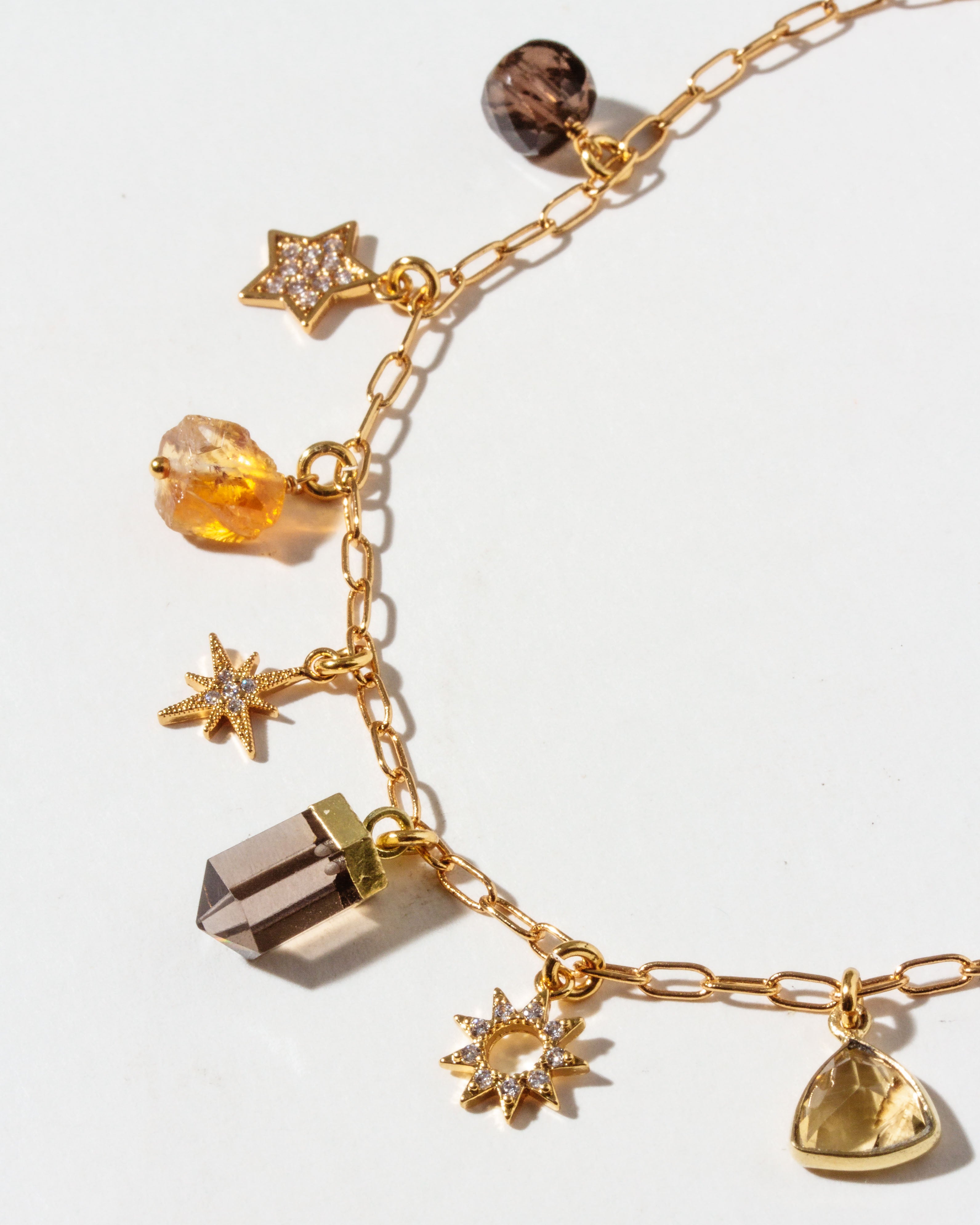 A little warmth, a little stardust—this necklace is a celebration of November’s golden glow. Featuring celestial and sun-kissed charms alongside smoky quartz crystal points, raw earthy citrine chunks, and faceted smoky and citrine bead drops, it captures the true color ranges of the season—from dusky ambers to radiant honey hues.