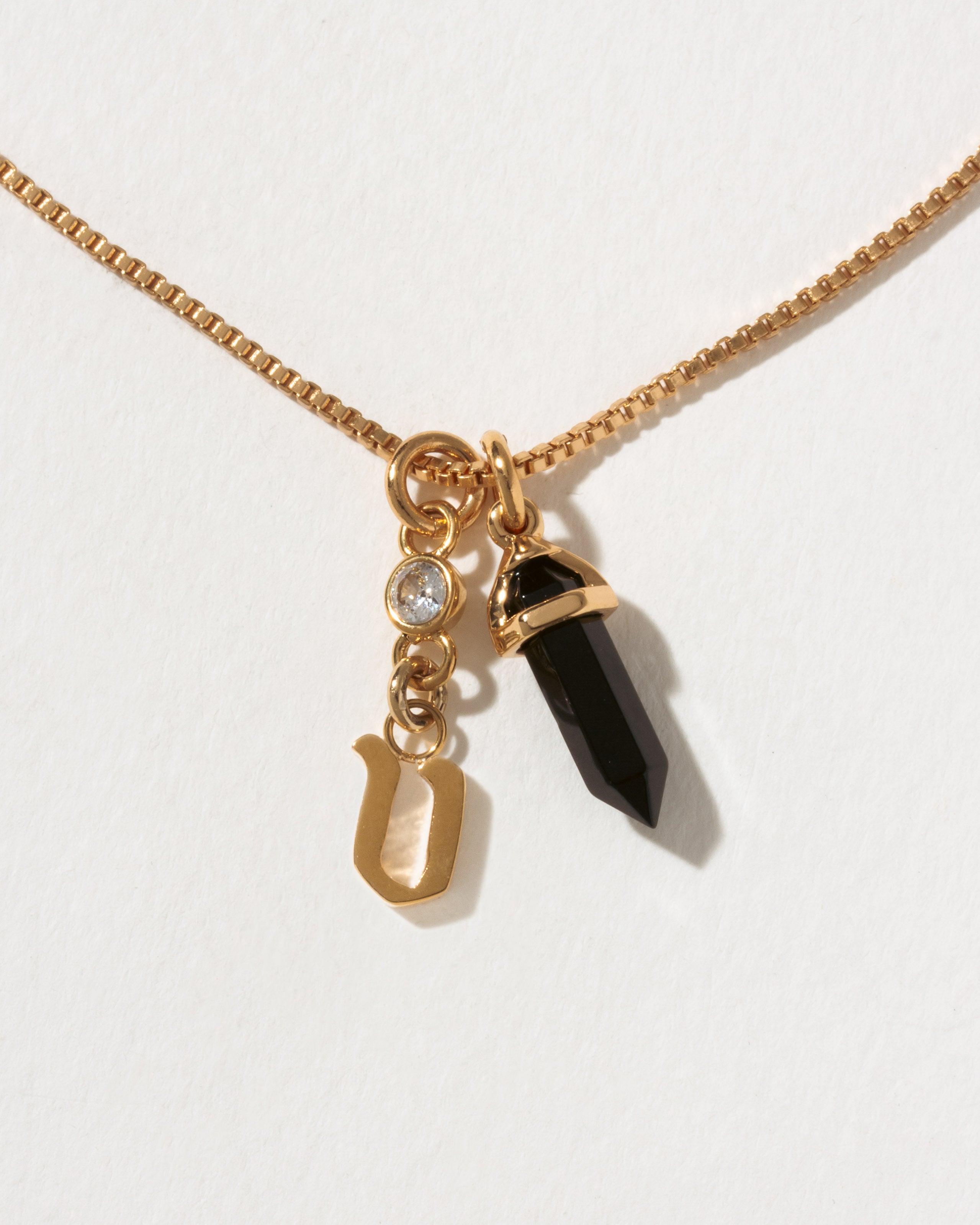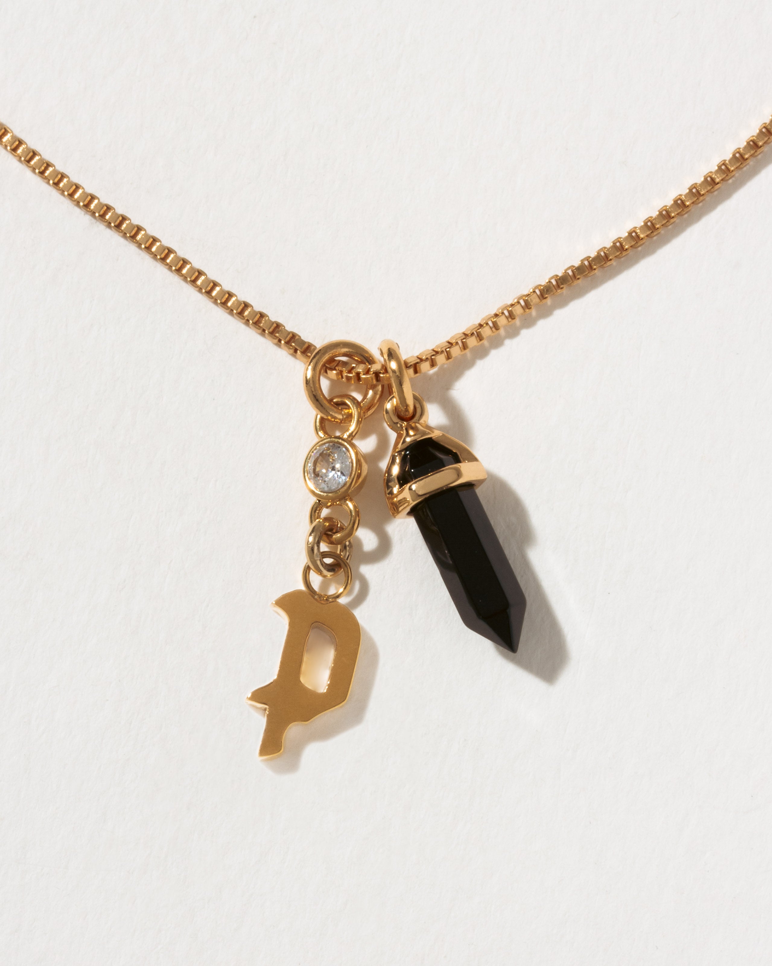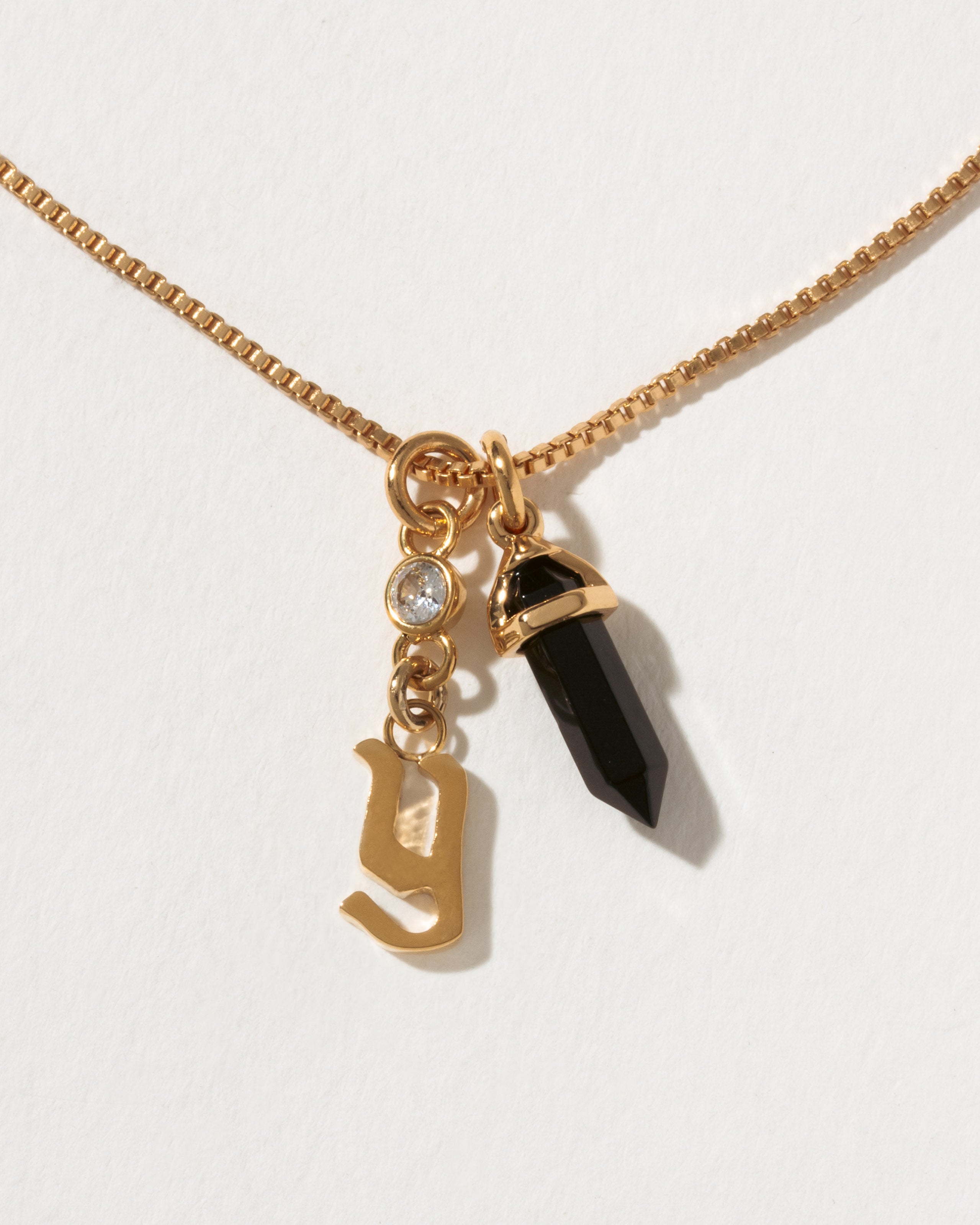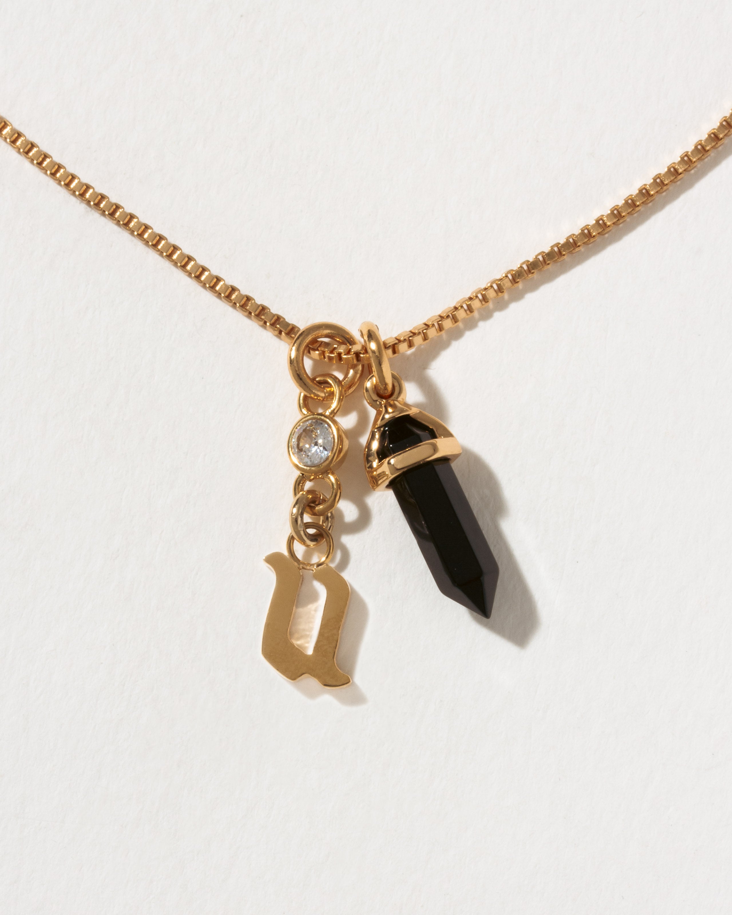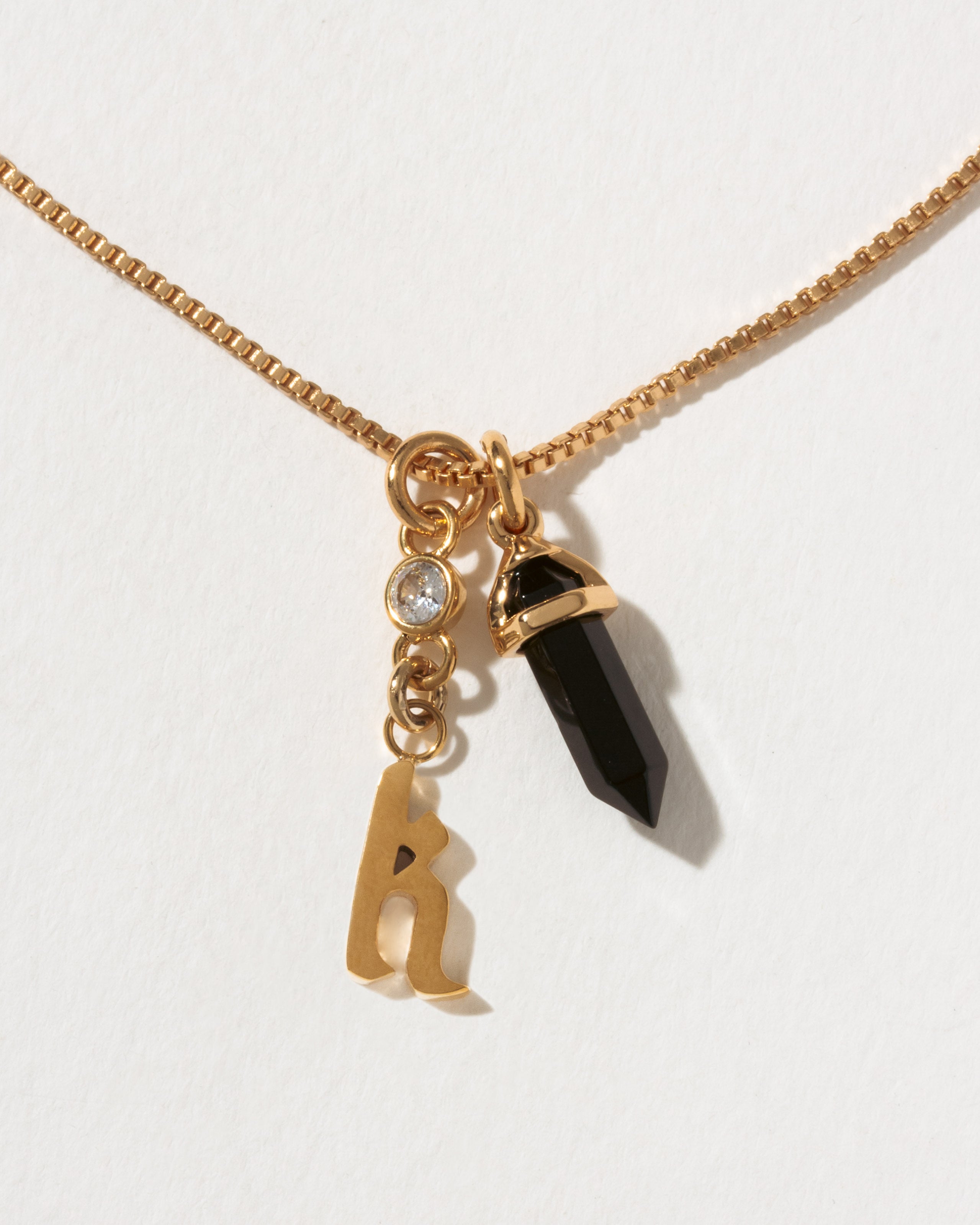 Meet the personalized initial necklace that feels anything but ordinary. A fresh take on everyday jewelry, this piece pairs a genuine black onyx mini crystal point charm with a sparkling CZ accent and a gothic-style lowercase initial—bringing together depth, edge, and just the right amount of shine.