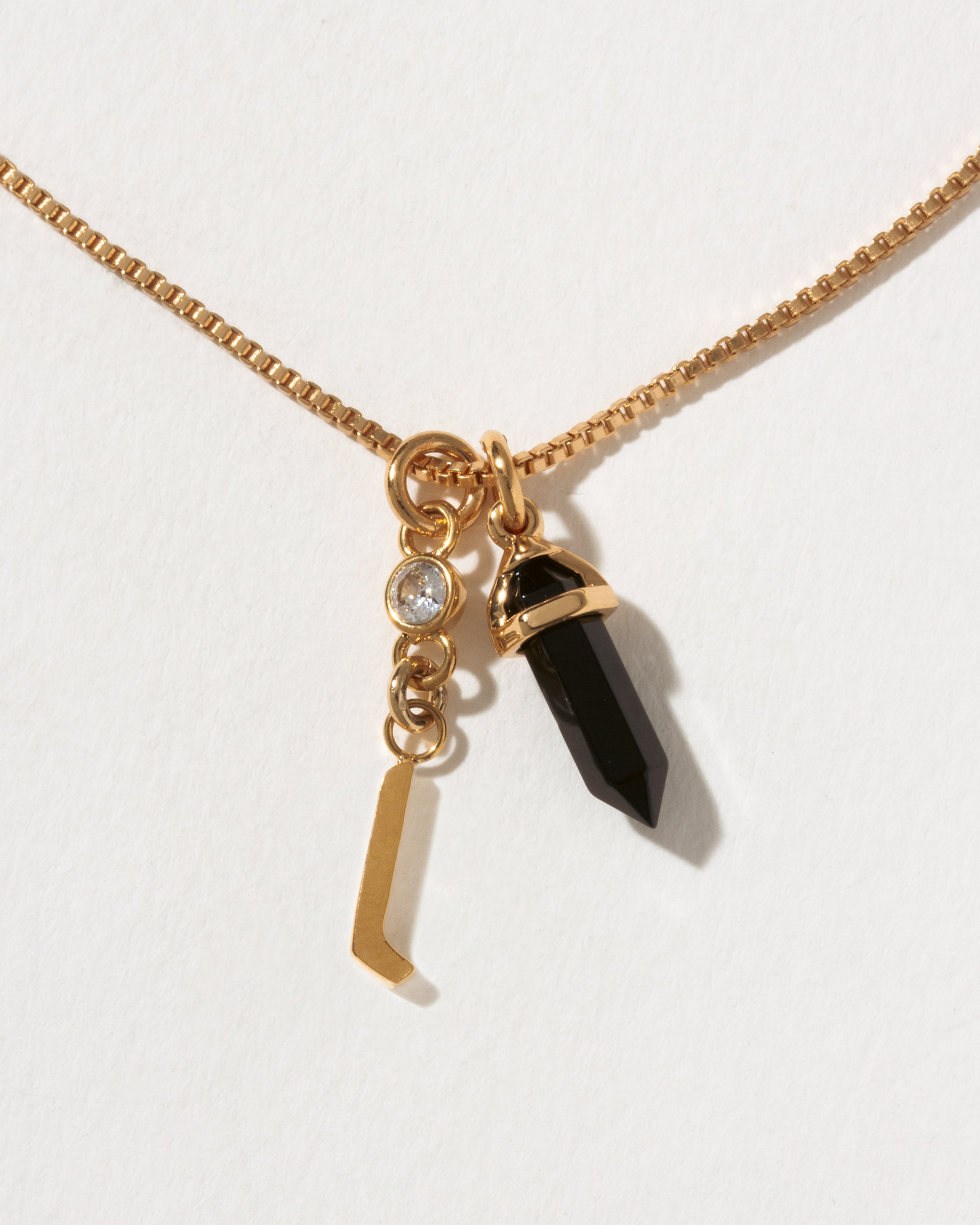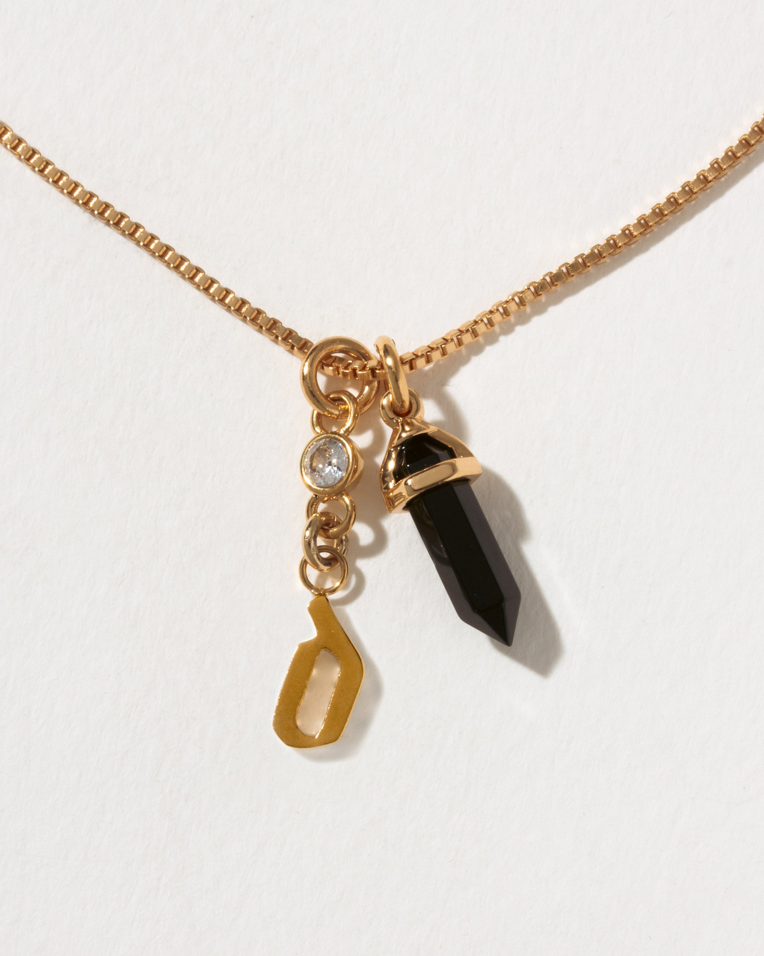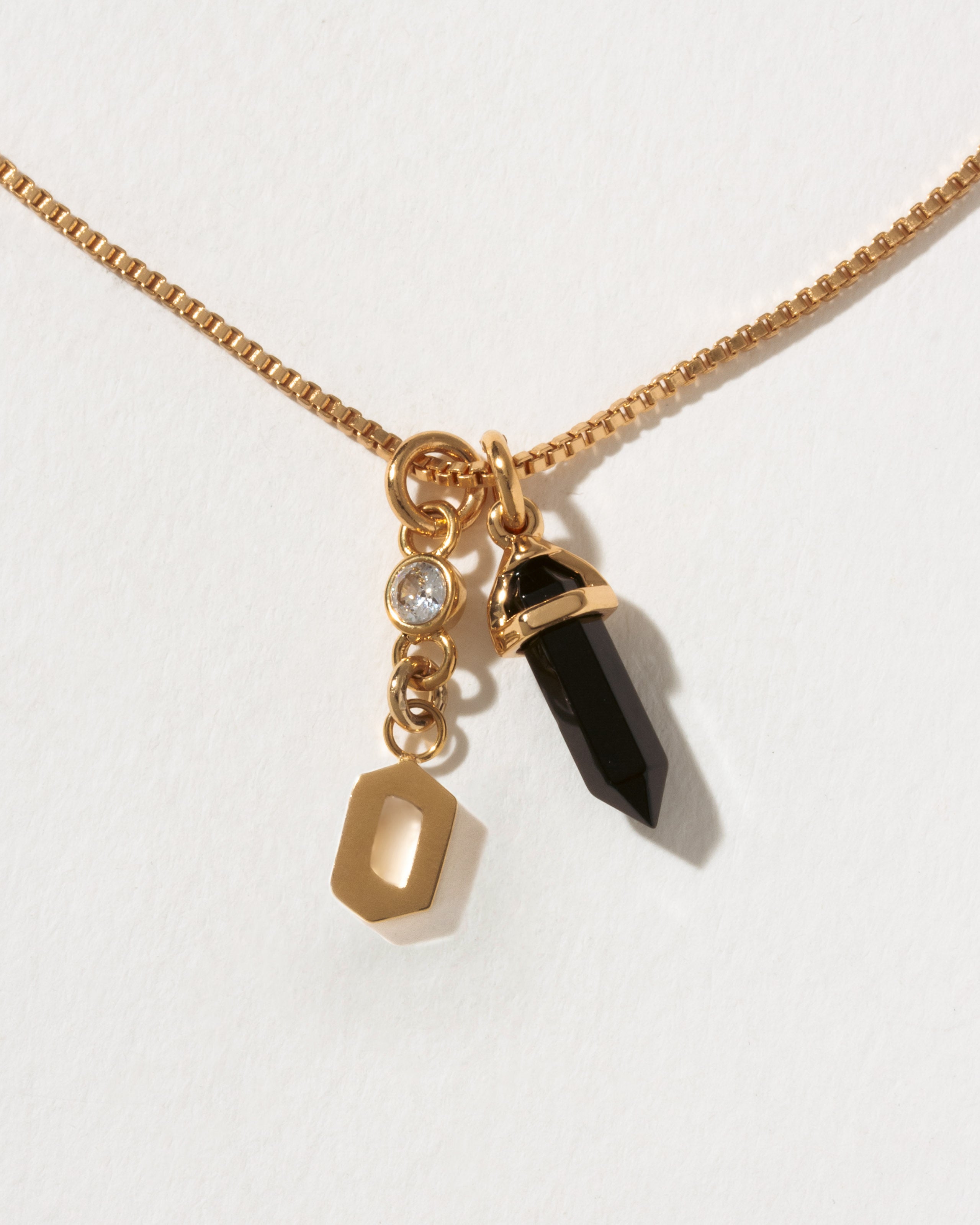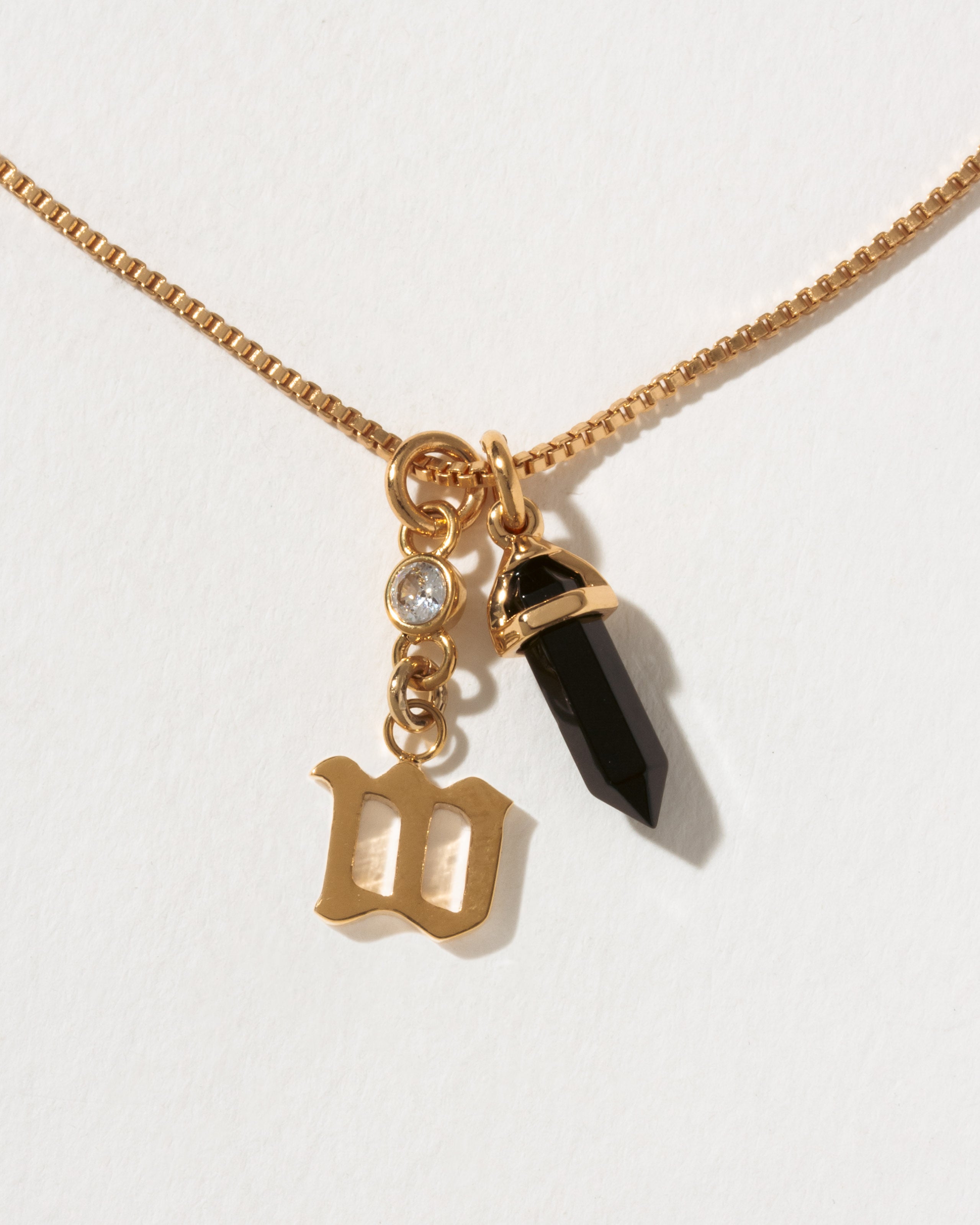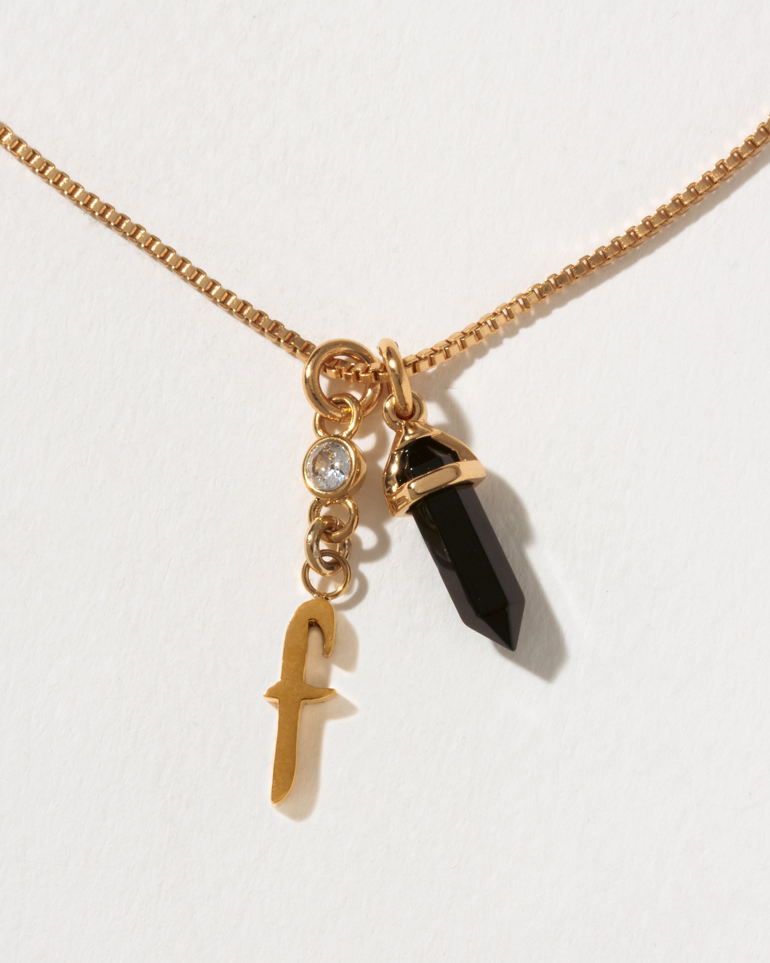 Meet the personalized initial necklace that feels anything but ordinary. A fresh take on everyday jewelry, this piece pairs a genuine black onyx mini crystal point charm with a sparkling CZ accent and a gothic-style lowercase initial—bringing together depth, edge, and just the right amount of shine.