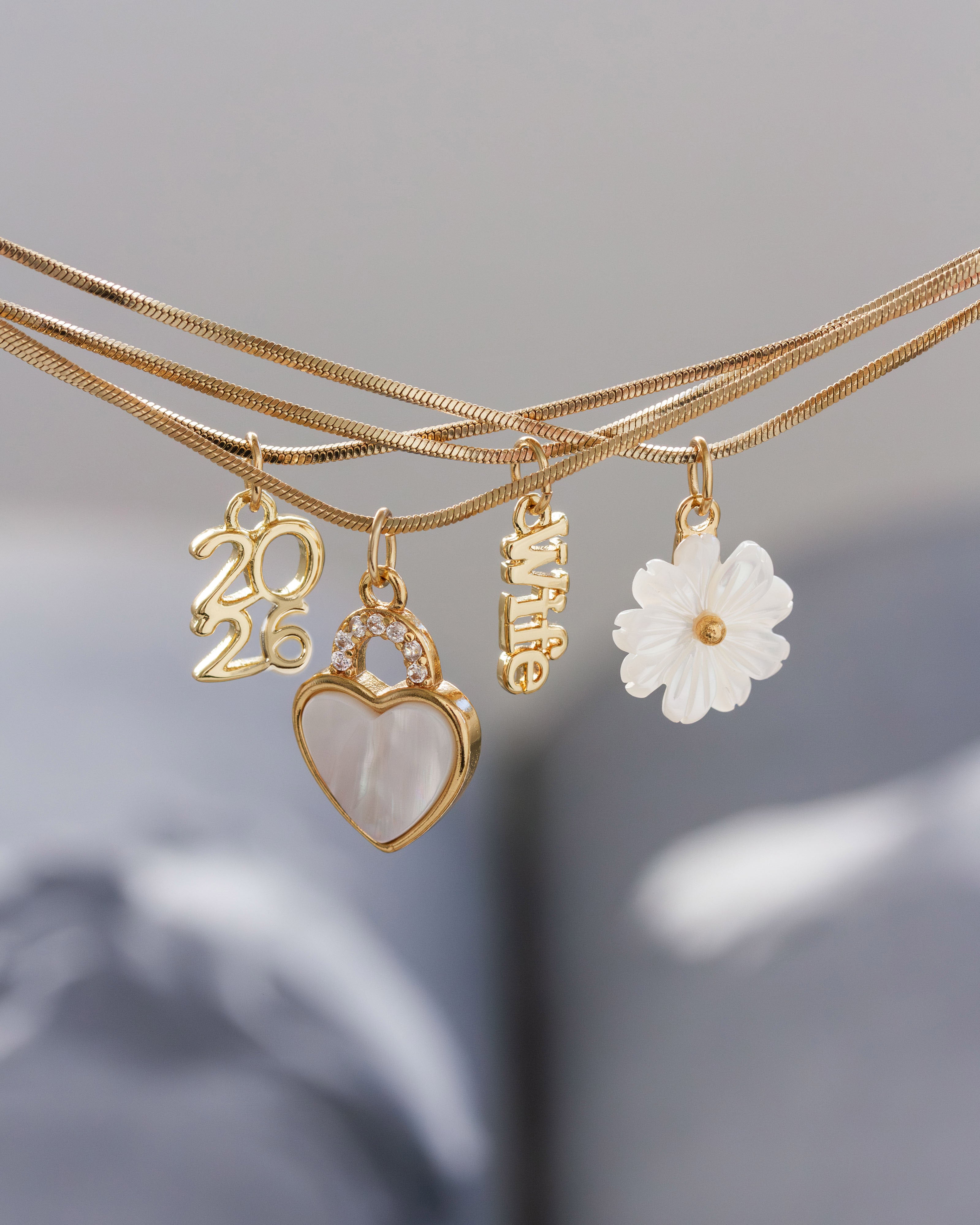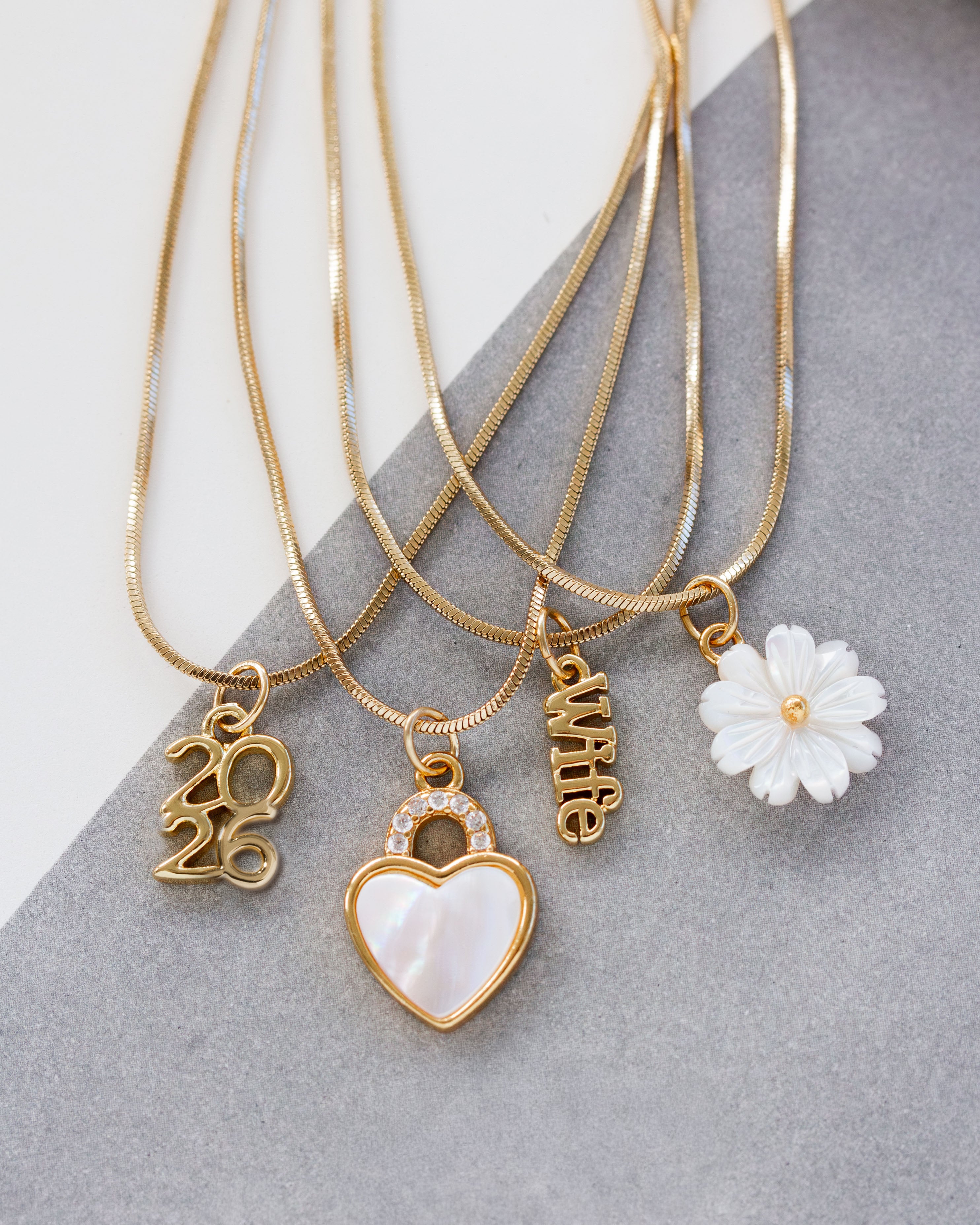 Crafted from sleek, gold-polished snake chain, this piece features four individual strands fused together for that effortless, stacked look. Each charm adds a personal touch: a carved flower (a nod to your bouquet), a locket heart symbolizing lasting love, and a "wife" charm to mark your beautiful new role.