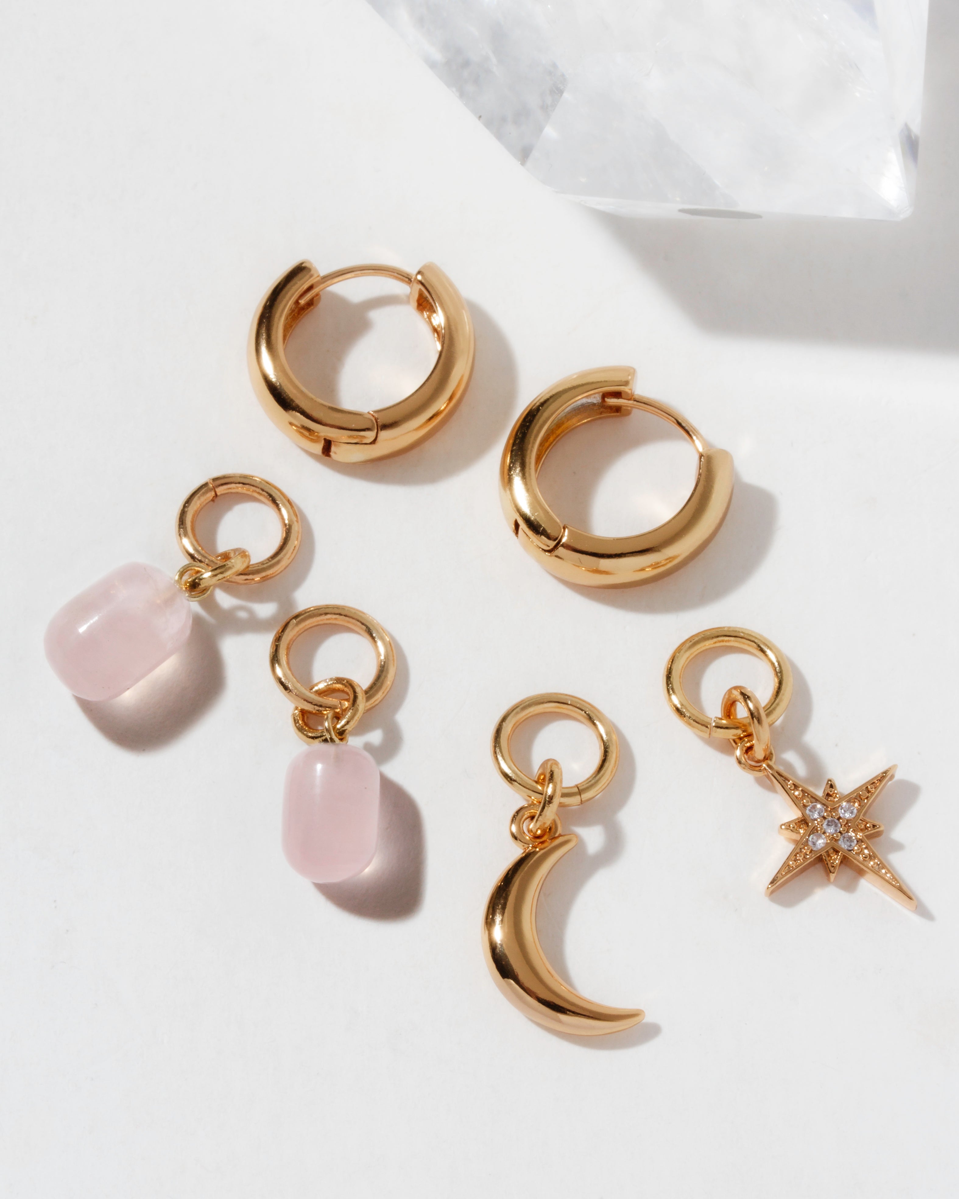 One hoop, endless possibilities. The Constella set includes pill-shaped gemstone drops and a celestial duo—one shimmering moon charm and one sparkling North Star. Wear them as a matching pair, mix stone with star, or style each charm solo for a look that’s never the same twice.