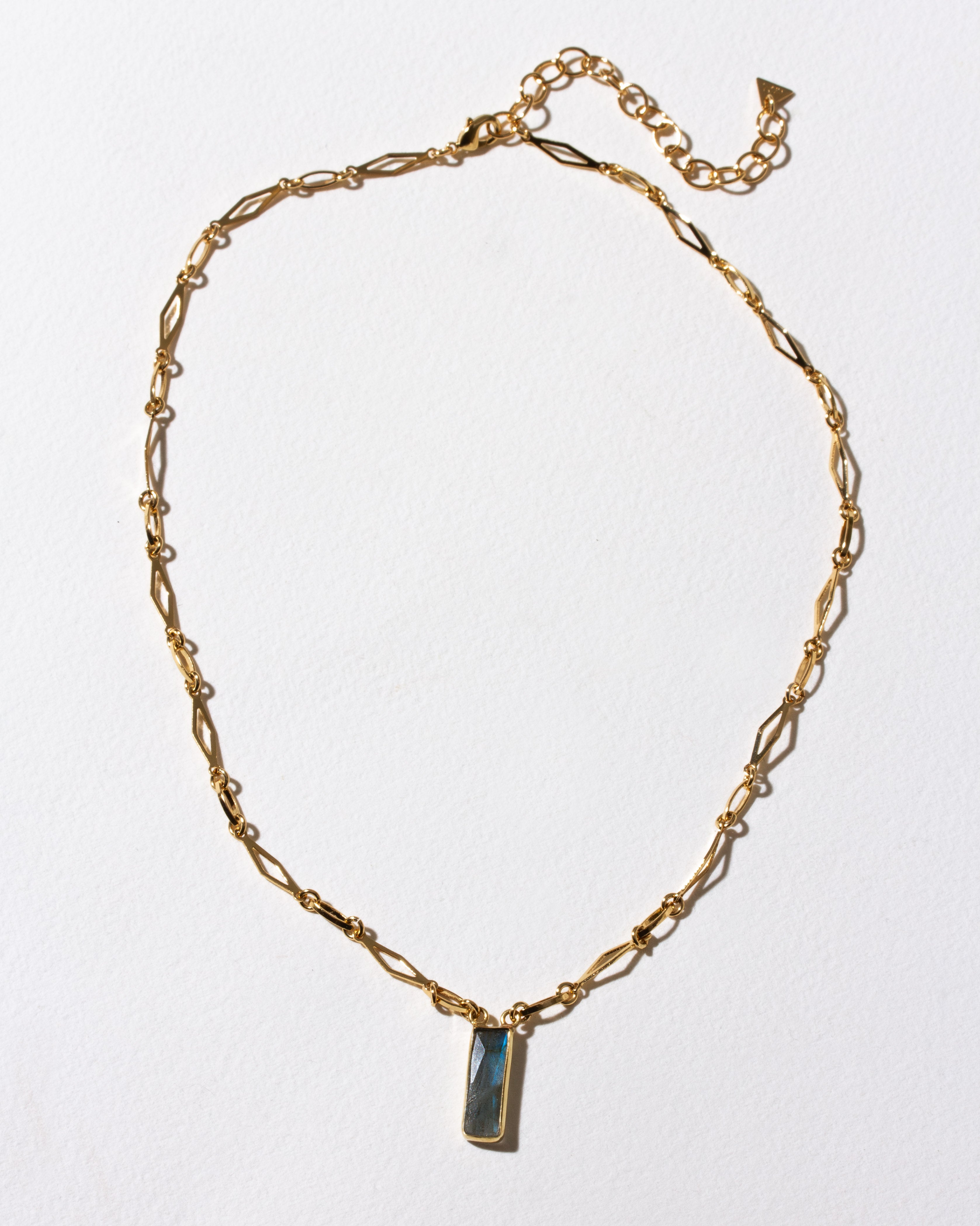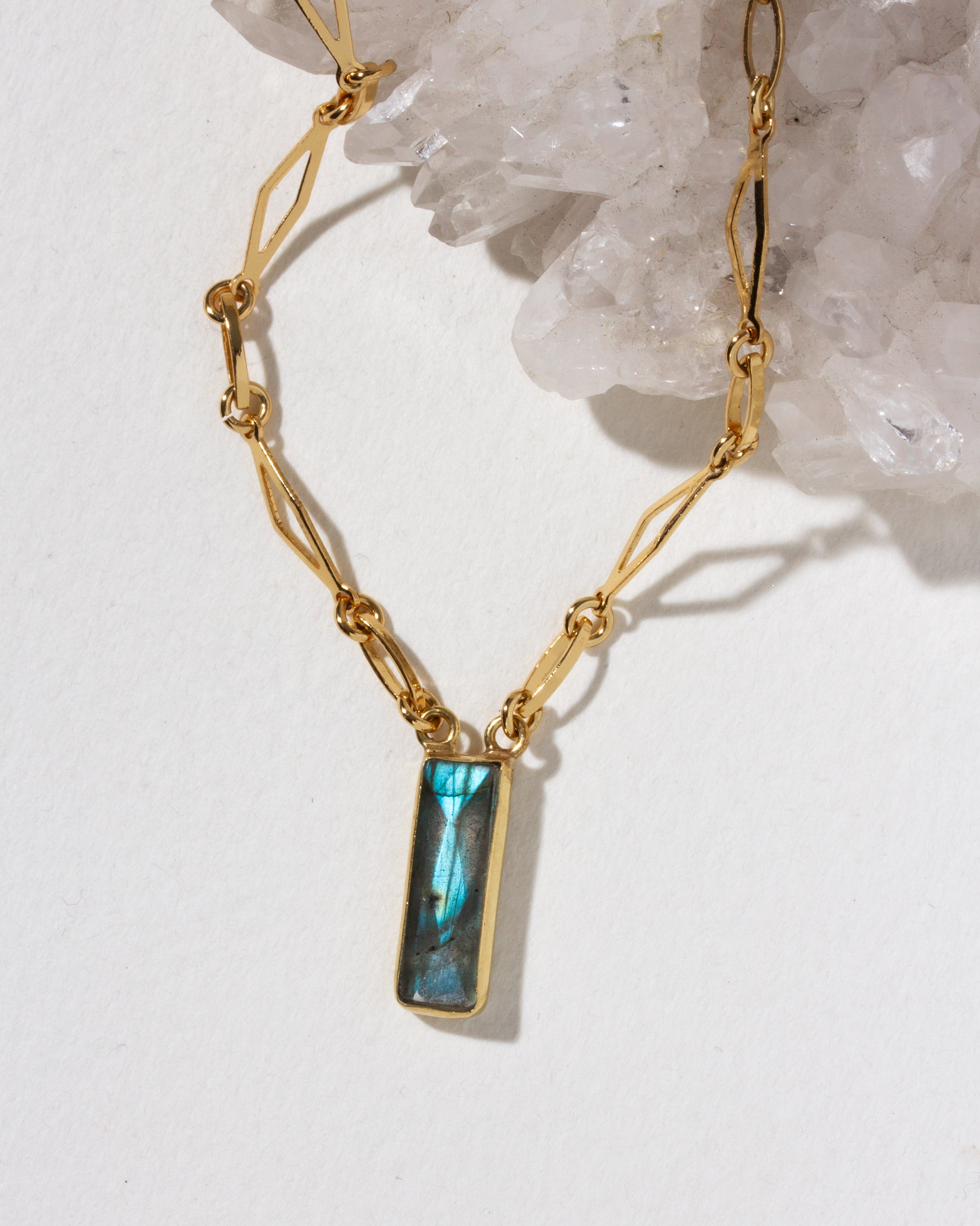 Balance, light, and transformation — all in one perfect line. A hand-cut labradorite pendant anchors this geometric chain, its shifting flashes of blue and green revealing new colors with every turn. Known as a stone of intuition and transformation, labradorite is said to guide individuals through change and spark creativity.