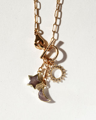Named for how its celestial charms cascade like a vine under the shifting skies, the Solstice Vine Toggle Necklace captures the perfect harmony of day and night. A gleaming gold paperclip-style chain is adorned with a charming CZ sun, crescent moon, and star-shaped Coffee Moonstone charms—symbolizing the balance between light and shadow, energy and tranquility.