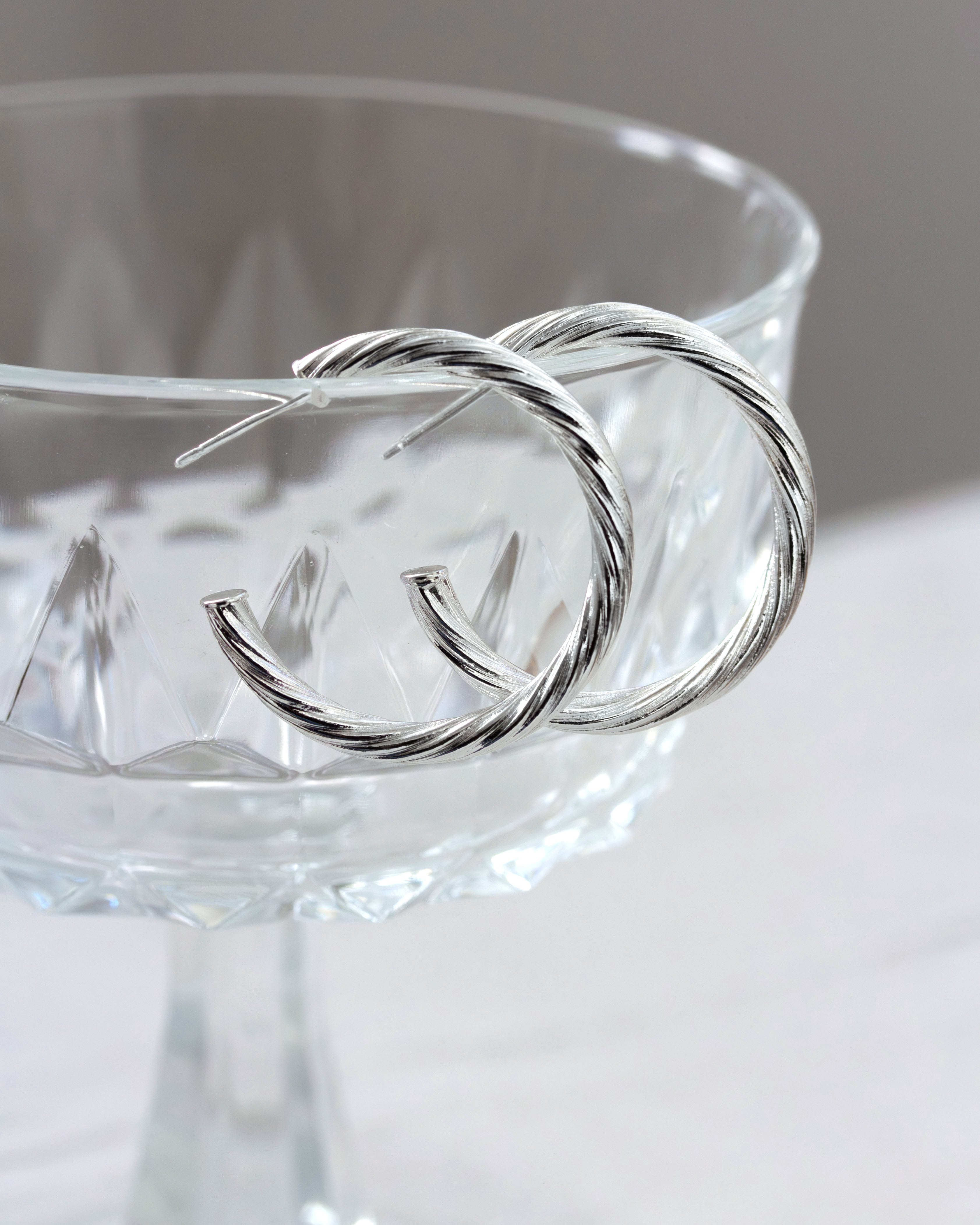 A medium-sized, chunky hoop earring with twisted details ideal for daily wear. A staple for any jewelry box. For added flair, pair with our Helix Twisted Conch Ear Cuff Pair. With little effort, throw these in and you're ready for the day – it's as simple as that.
