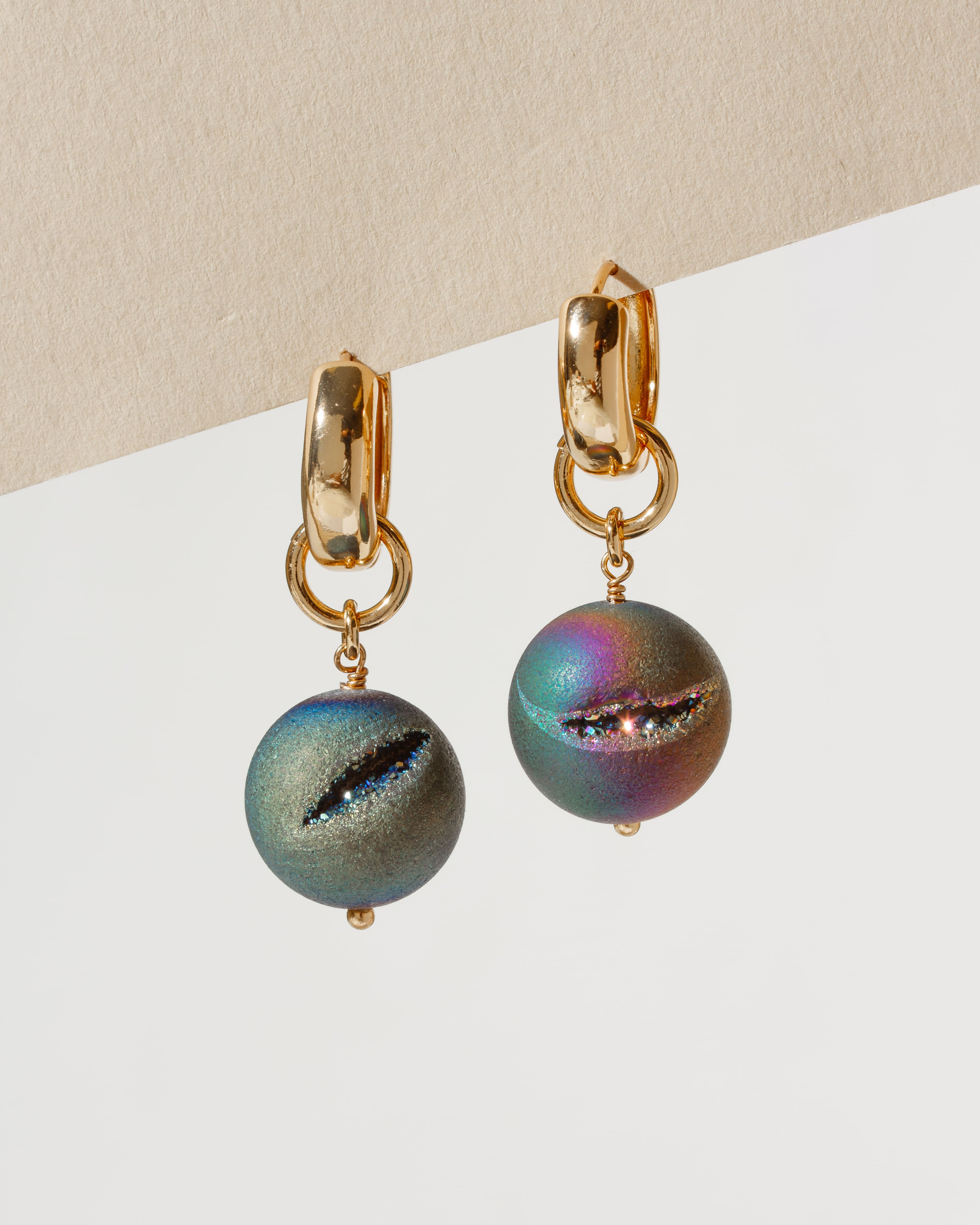 A vibrant, colorful druzy sphere bead that captures the celestial magic of naturally sparkling gems. Showcasing the beauty of a druzy crevice, these charms rotate and shimmer with every move, reflecting the wonder of the universe.