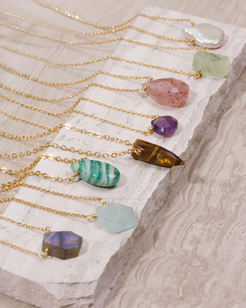 Every necklace is a total mystery in the best way. We hand-select the stone color and shape for you, making each one a one-of-a-kind treasure. Whether your gem arrives in soft neutrals or vibrant hues, it will add effortless charm and a hint of sparkle to any look.